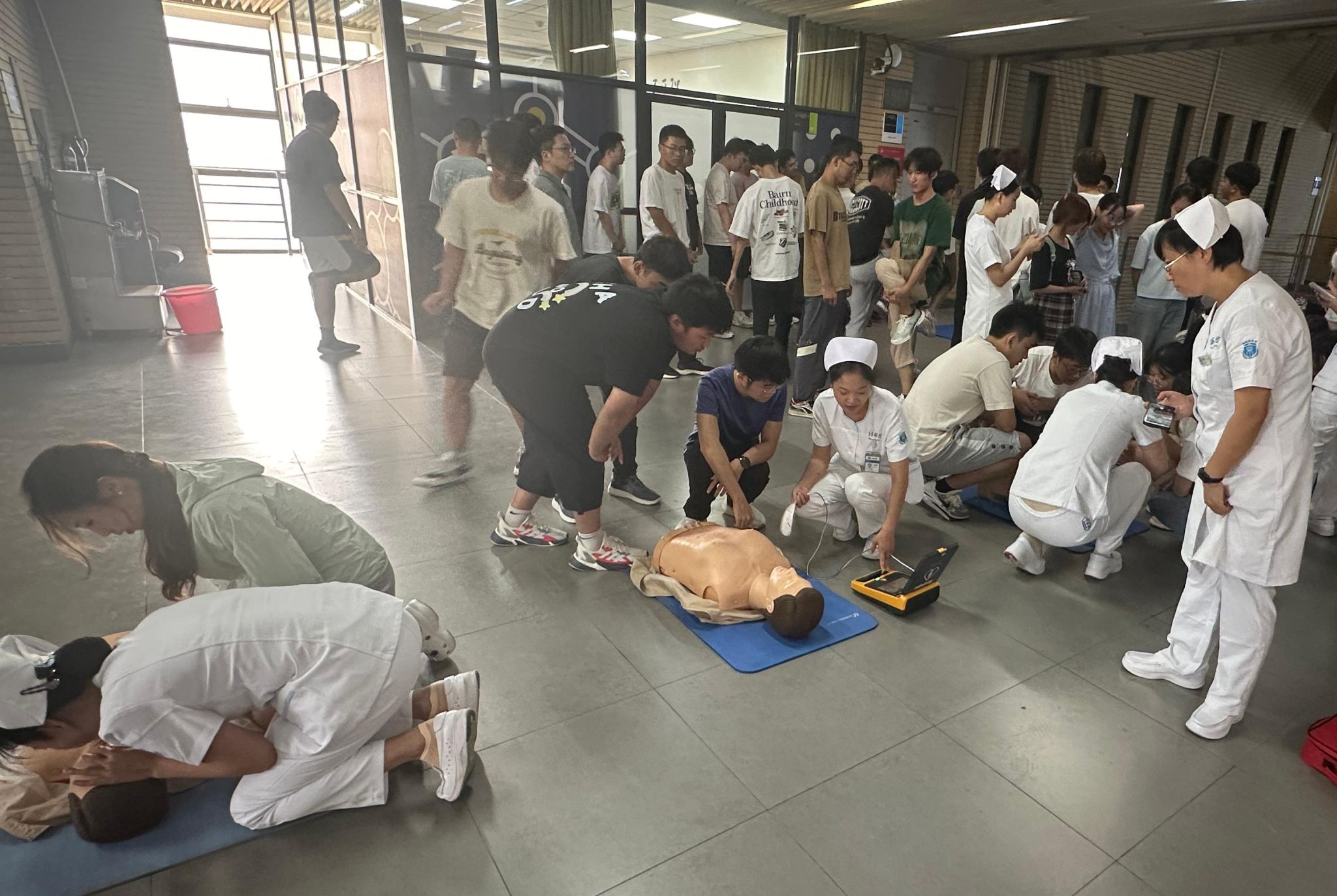 随后,医护人员结合真实案例,向同学们讲述了掌握急救知识的重要性。并通过现场理论讲授和实操演练的方式,从AED和心脏骤停、如何识别判断心脏骤停、如何正确拨打急救电话和呼救求助到心肺复苏操作、AED使用原理、目的、适应症、禁忌症、操作规范、注意事项等方面进行了详细讲解,并利用人体模型进行了现场心肺复苏及自动电除颤操作演示。现场气氛热烈,同学们情绪高涨,认真记录医护人员所提到的注意事项,仔细观察操作手法,并积极实践,亲身体验急救过程。医护人员从专业角度指出同学们操作中存在的不当之处,并给予积极指导,帮助每一个实践同学掌握准确的急救行为。